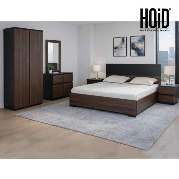 Product Includes: 1 Bed Frame with 2 Side Tables + 1 Dresser + 1 Mirror + 2 Door Wardrobe