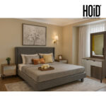 Dotted Fabric Bed in Suede Fabric with 2 Turn Side Tables, Dresser & Mirror