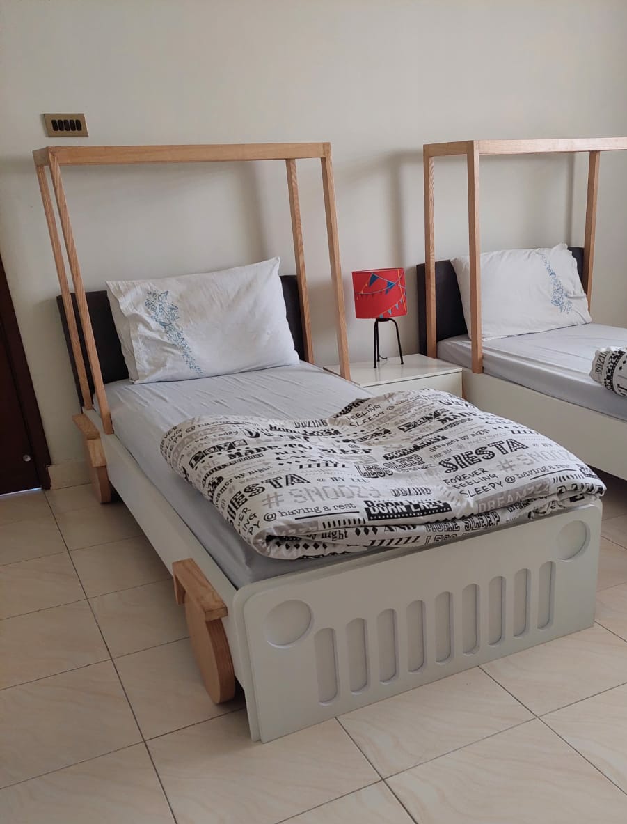 Material: Oak Wood frame with Melamine and tufted cushioned back in Jute Fabric