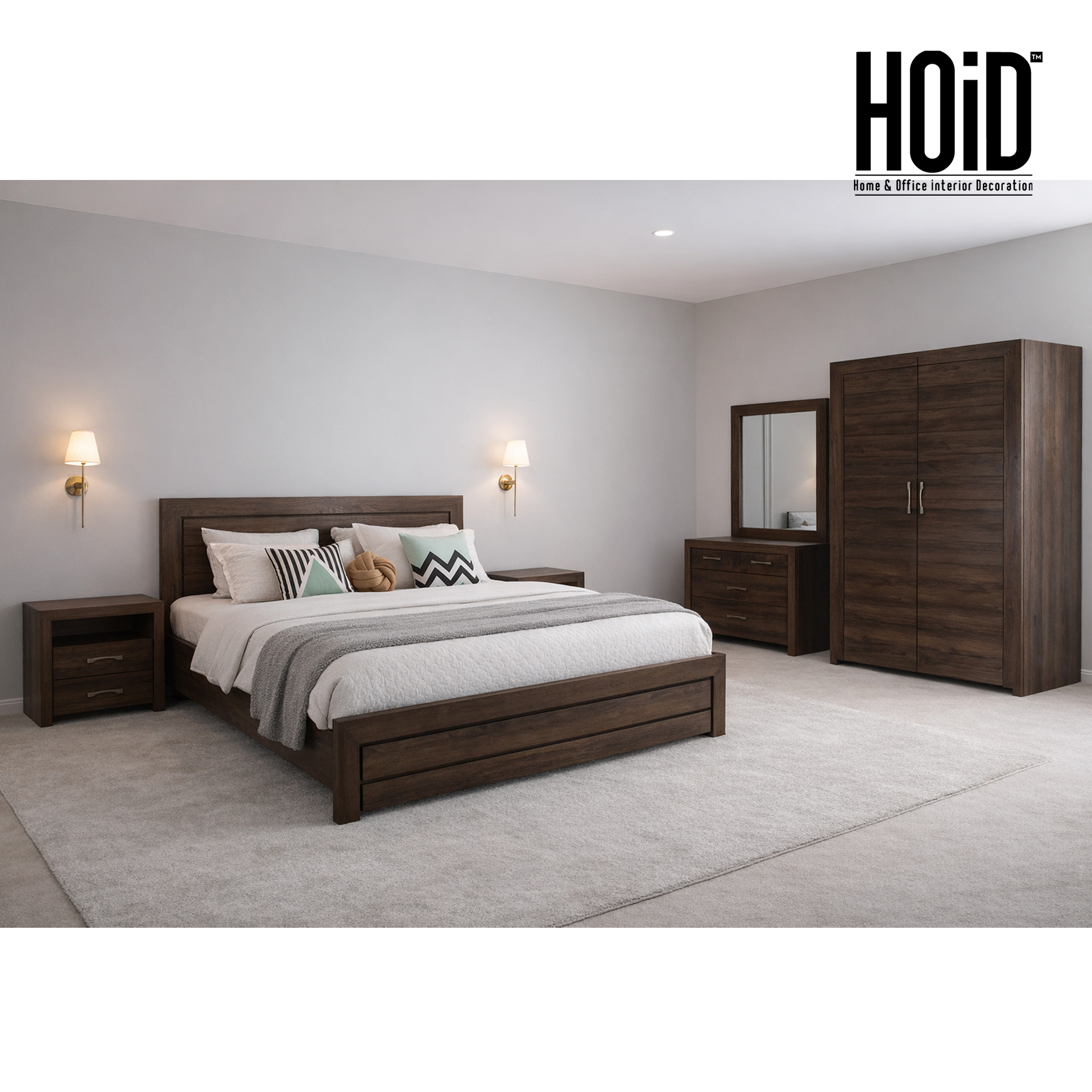 Products Includes: 1 Bed Frame + 2 Side Table + 1 Dresser + 1 Mirror + 2 Door Wardrobe