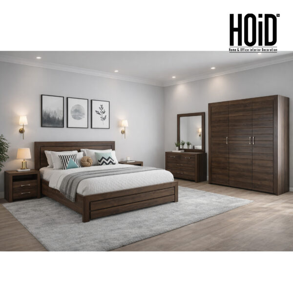 Products Includes: 1 Bed Frame + 2 Side Table + 1 Dresser + 1 Mirror + 3 Door Wardrobe