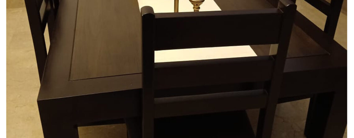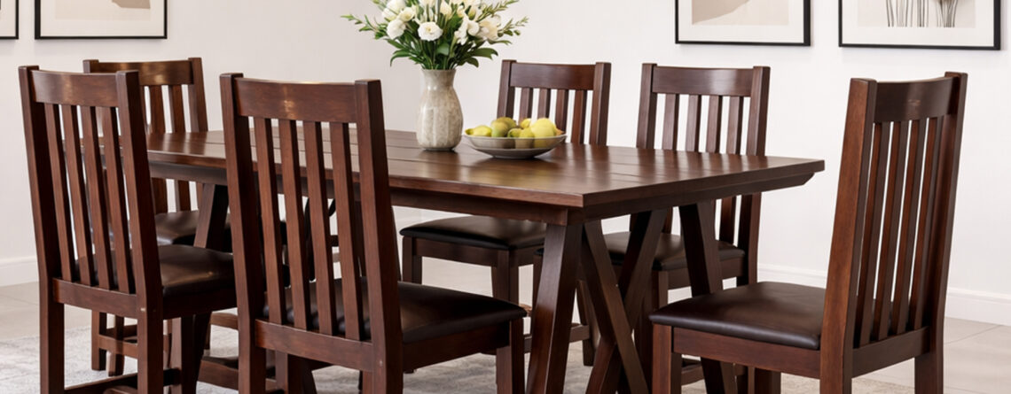 Material: Melamine with Solid Wood Chairs [Polished legs] Table Colors: Chocolate Brown Melamine | Synchro Walnut Brown Melamine Chair Colors: Grey | Brown | Beige | Black | Red | Blue Dimensions: Height: 31" | Length: 6.5 feet [78"] | Depth: 42" Chair: Back Height: 37″ | Sitting Height: 20″ | Length: 21″