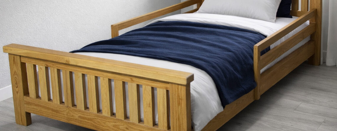Material: Pure wooden railing with Oak Board Colors: Black | Walnut Brown | Dark Sheesham | Oak Dimensions: 3 ft by 6 ft mattress fit in size Back Height: 36" | Foot Board Height: 14"