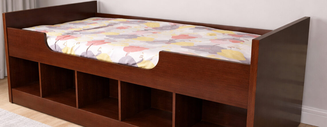 Storage shelves on both sides of the back board Hallow Shelf on the back board Material: Melamine Colors Available: Black Textured Melamine | Synchro Walnut Brown | Dark Bronze Melamine Dimensions King size: 3 ft by 6.5ft | Back Board Height: 50" Foot Board Height: 16" | Legs: 2" Voucher valid for: 1 Bed Frame, board for mattress *No mattress included