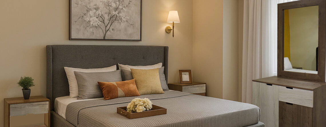 Dotted Fabric Bed in Suede Fabric with 2 Turn Side Tables, Dresser & Mirror