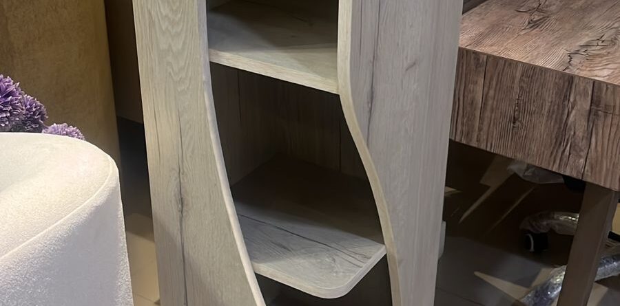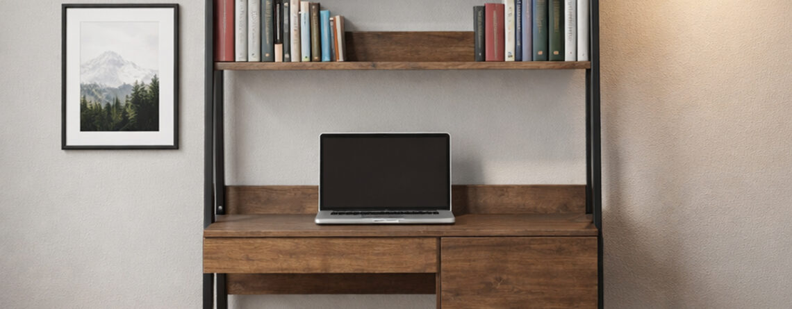 Material: Melamine with Pure Wood Legs Colors available: Dark Bronze Melamine | Synchro Walnut Brown Melamine | Black Texture Melamine | Pegodas Brown Melamine Dimensions: Height: 6 ft | Length: 3.5 ft | Depth: 18" | Table Height: 30" 1st Shelf: Depth: 11" | 2nd Shelf Depth: 9.5" | Third Shelf Depth: 8"