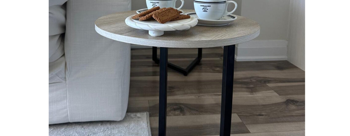 Material: Melamine Table Top, Wrought Iron Base Colors Available: Synchro Walnut Brown Melamine | Black Textured Melamine | Dark Bronze Melamine *legs in Black Dimensions: Big table: Height: 22" | Diameter: 20" Small Table: Height: 19" | Diameter: 18"