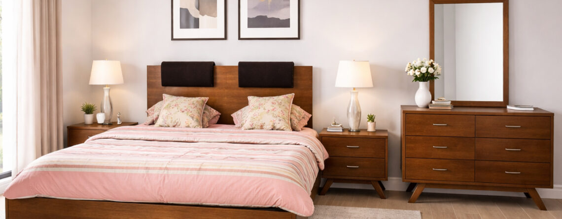 Material: Melamine and Solid Wood Leg Structure Colors Available: Pegodas Brown Melamine | Dark Bronze Melamine | Synchro Walnut Brown Melamine Dimensions: King Size: 6 ft by 6.5 ft | Queen Size: 5 ft by 6.5 ft Bed Back Board Height: 42" | Foot Board Height: 15" | Back Board Length: 64" |Legs Height: 7" Side Table Dimensions: Height: 18" | Length: 22" | Depth: 16" Dresser Dimensions: Height: 30" | Length: 4 ft | Depth: 18" Mirror Frame Dimensions: Height: 27" | Length: 33"