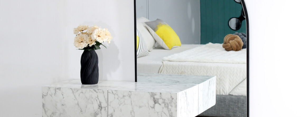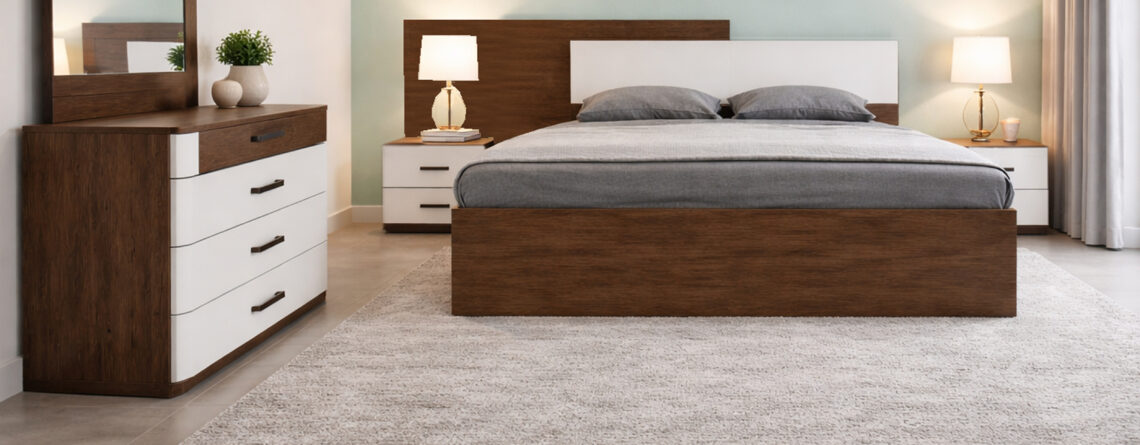 Material: Melamine Colors Available: Off White with Pegodas Melamine | Off White with Synchro Walnut Brown Melamine | Off White with Dark Bronze Melamine Dimensions: King size: 6 ft by 6.5 ft | Queen Size: 5 ft by 6.5 ft Total Back Board Height: 46" Bed Back Board Height: 40" | Foot Board Height: 16" Side Table: Height: 18" | Length: 20" | Depth: 16.5" Dresser Height: 30″ | Length: 3 ft | Depth: 18″ Mirror Height: 36″ | Length: 36″