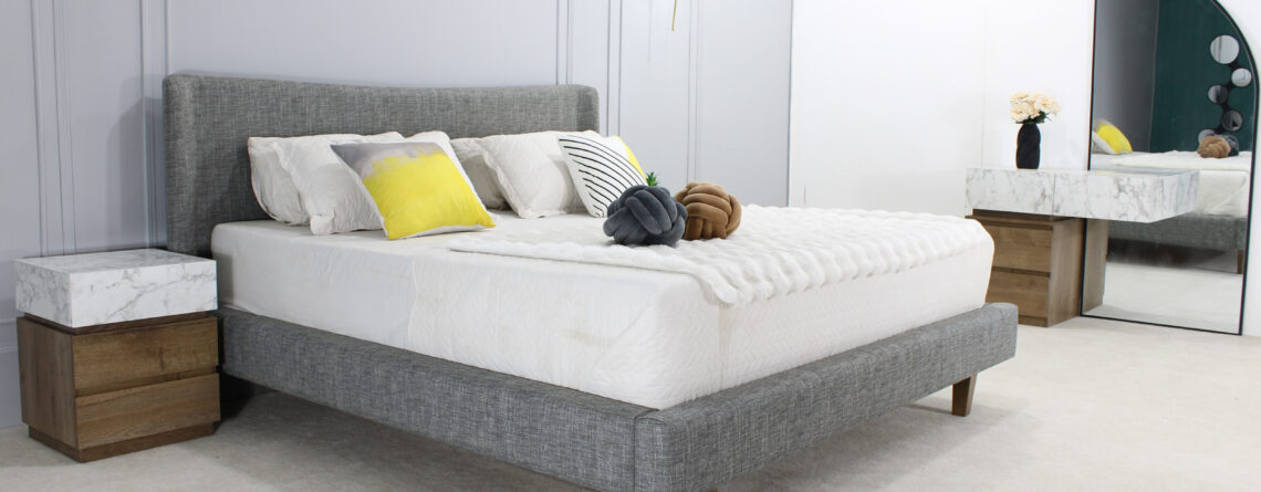 Material: Melamine Colors Available: Off White Marble with Synchro Walnut Brown Melamine | Off White Marble with Pegodas Brown Melamine Dimensions: King size: 6 ft by 6.5 ft | Queen Size: 5 ft by 6.5 ft Bed Back Board Height: 44.5 Inches | Foot Board Height: 14 Inches | Legs Height: 7 Inches Side Table: Height: 22" | Length: 18" | Width: 16"