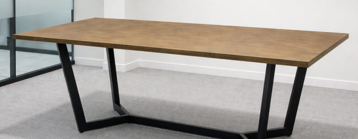 Material: Base in Rod Iron with Powder Coated, Table Top in Melamine Colors: Egyptian Texture Melamine | Dark Bronze Melamine | Sychro Walnut Brown Melamine *Base in Black Dimensions: Height: 29" | Length: 6 ft | Depth: 3.5 ft