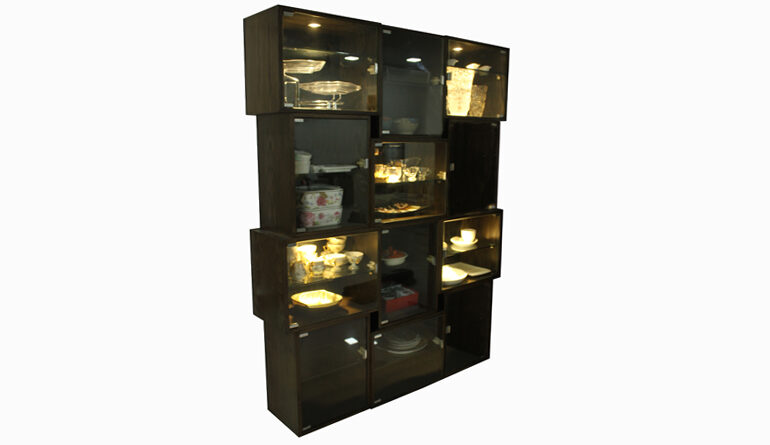 Material: Melamine, 5 mm Glass Doors, 5 mm glass shelves Colors available: Dark Bronze Melamine | Synchro Walnut Brown Melamine Dimensions: Height: 72" | Length: 56" | Depth: 12"