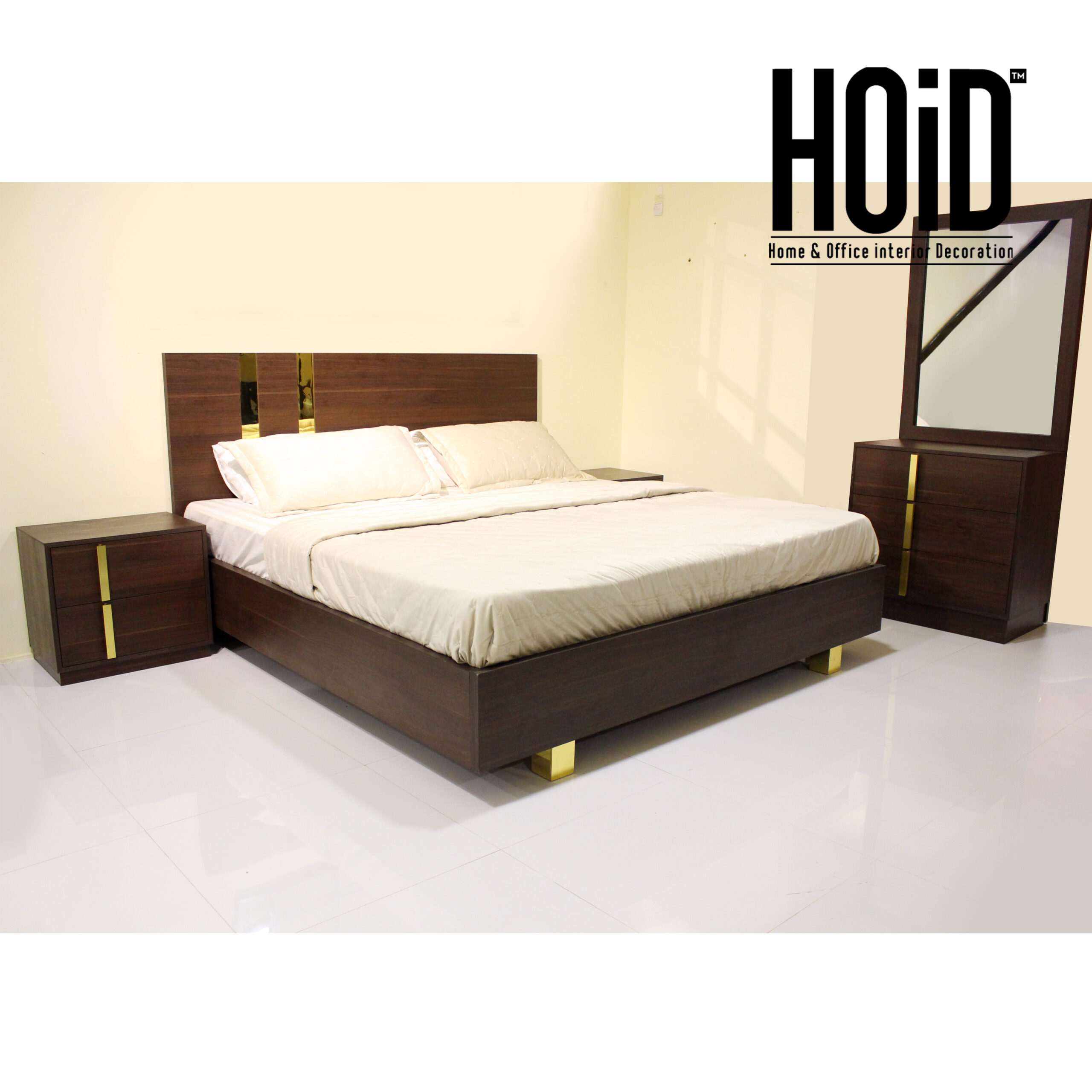 Material: Melamine with Acrylic Designing Colors Available: Walnut Tex Melamine | Synchro Walnut Brown Melamine | Urban Grey Melamine Dimensions: King Size: 6 ft by 6.5 ft | Queen Size: 5 ft by 6.5 ft Back Board Height: 44" | Foot Board Height: 14" Side Table: Height: 19" | Length: 22" | Depth: 16" Dresser: Height: 30" | Length: 30" | Depth: 18" Mirror: Height: 40" | Length: 30"