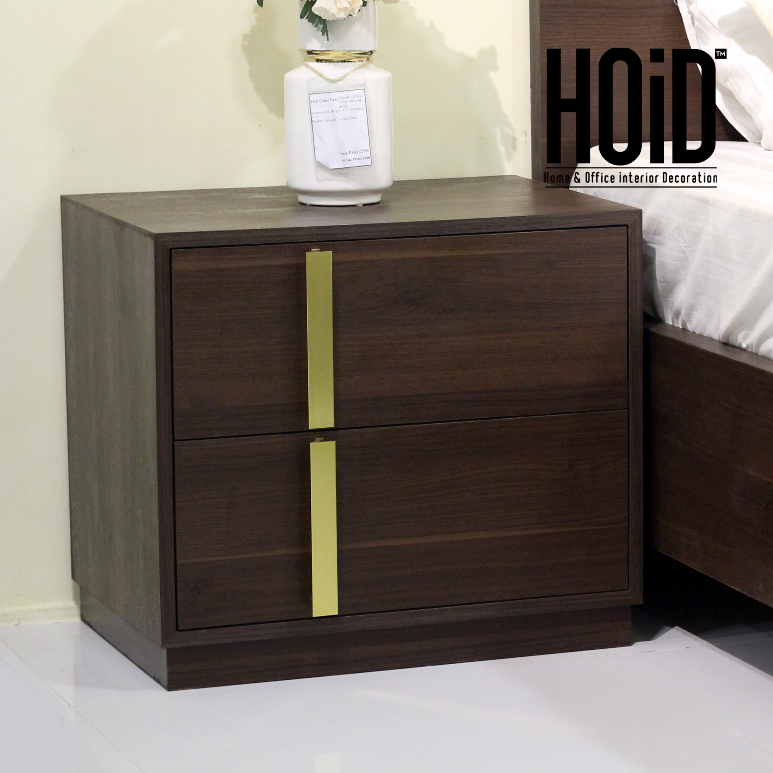 Material: Oak Pressing with Polish Colors Available: Synchro Walnut Brown Melamine | Pegodas Brown Melamine | Dark Bronze Melamine Dimensions: Bed Back Board Height: 42" | Foot Board Height: 16" Side Tables: Height: 22" | Length: 22" | Depth: 16" | Open Shelf Height: 4.5" | Legs Height: 1.5"