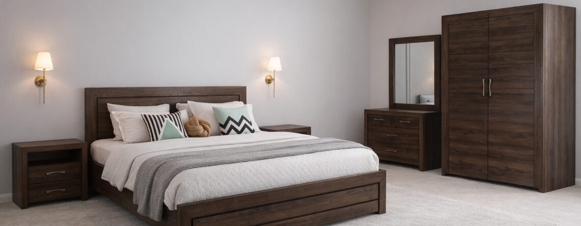 Material: Melamine Colors Available: Synchro Walnut Brown Melamine | Pegodas Brown Melamine | Dark Bronze Melamine Dimensions: Bed Back Board Height: 42" | Foot Board Height: 16" Side Tables: Height: 22" | Length: 22" | Depth: 16" | Open Shelf Height: 4.5" | Legs Height: 1.5" Dresser: Height: 2.5 ft | Length: 3 ft | Depth: 18" Mirror Frame: Height: 3.5 ft | Length: 3 ft | Depth: 1.4" Wardrobe Dimensions: Height: 6.5 ft | Length: 4.5 ft | Depth: 22"
