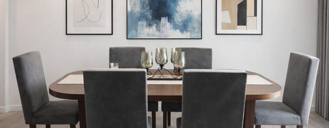 Material: Melamine Table top, Legs Pure Wood Dimensions: Height: 32" | Length: 6.5 ft | Depth: 3.5 ft | Table top: 3" | Legs Thickness: 4" Table Colors Available: Synchro Walnut Brown Melamine | Dark Bronze Melamine Seat Colors: Grey | Black | Walnut Brown