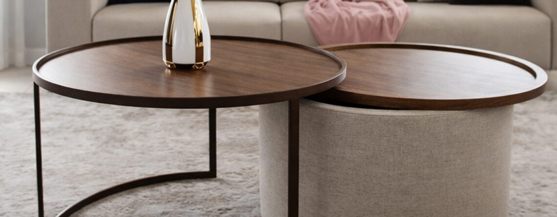 Material: Big Table Structure is Iron, Tables top is Melamine Color: Pegodas Melamine | Dark Bronze Melamine | Synchro Walnut Brown Melamine *Brown Legs & Beige Fabric on Storage Box Dimensions: Big Table Height: 22 Inches | Diameter: 36 Inches Small Table Height: 19 Inches | Diameter: 32 Inches