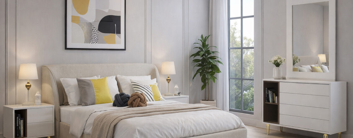 Material: Melamine with Suede Fabric Tufting, Pure Wooden Legs Colors Available: White | Red | Blue | Grey | Green | Beige | Black Dimensions: King Size: 6 ft x 6.5 ft | Queen Size: 5 ft by 6.5 ft Back Board Height: 55″ | Foot Board Height: 16.5″ Side Table Height: 21.5″ | Length: 18″ | Depth: 16″ | Legs Height: 12″ Dresser: Height: 32" | Length: 4.5 ft | Depth: 18" Mirror: Diameter: 3 feet
