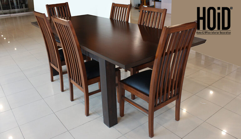 Material: Oak board with wooden legs table top, pure wooden chairs Colors Available: Black | Walnut Brown | Dark Sheesham Dimensions: Table Height: 32" | Length: 6.5 ft | Depth: 3.5 ft Chairs Seat Height: 18"