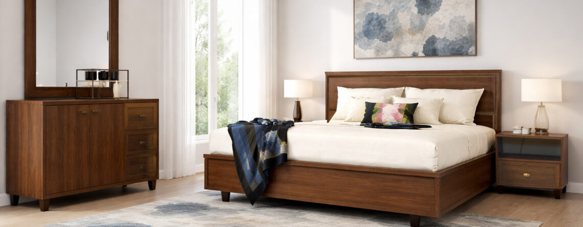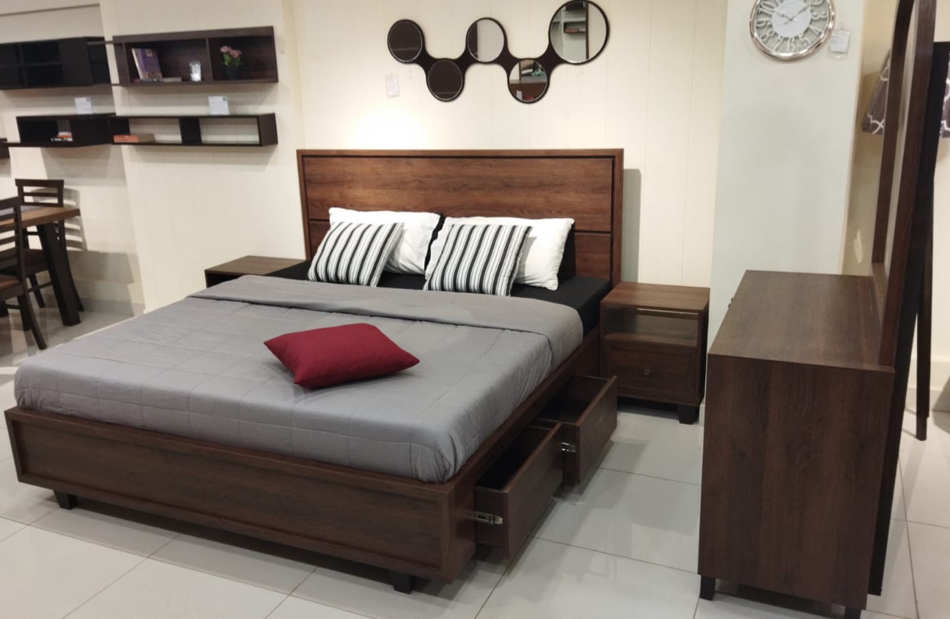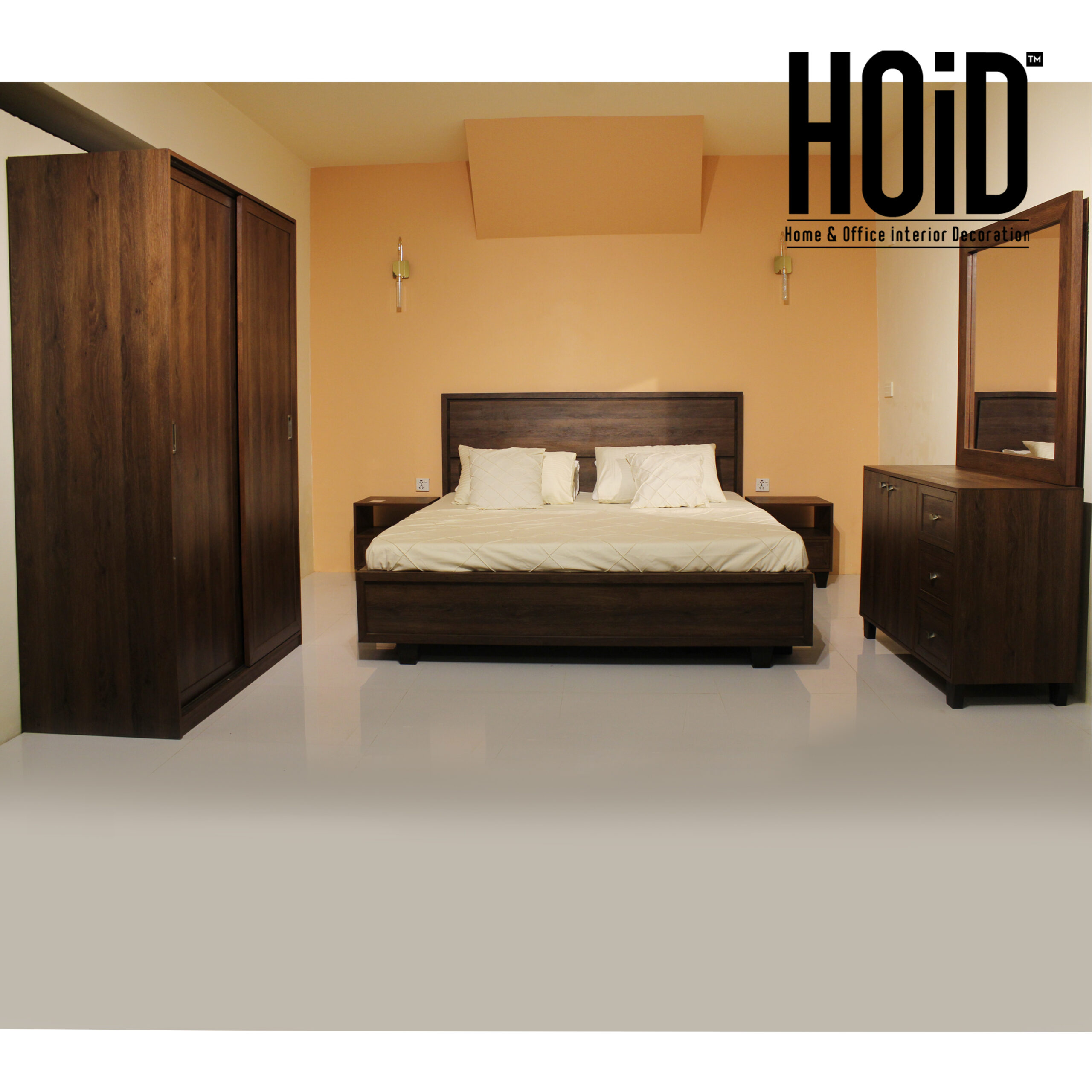Material: Melamine Colors Available: Dark Bronze Melamine | Synchro Walnut Brown Melamine Dimensions: King Size: 6 ft by 6.5 ft | Queen Size: 5 ft by 6.5 ft Back Board Height: 4 ft | Foot Board Height: 16" Side Tables: Height: 20" | Length: 18" | Depth: 16" Dresser Height: 32" | Length: 3.5 ft | Depth: 18" Mirror: Height: 41" | Length: 38" Wardrobe: Height: 6.5 ft | Length: 48" | Depth 22"