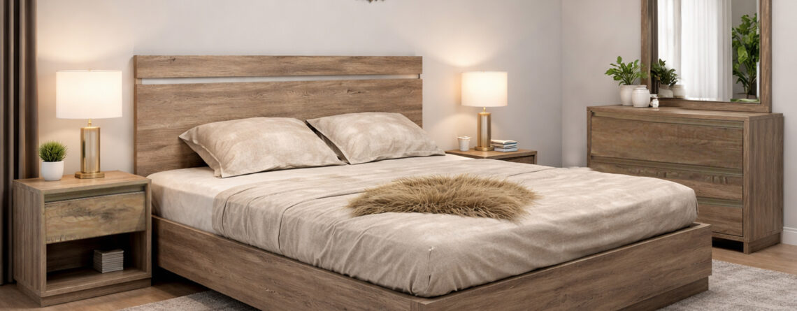 abbaVa Designer Bed with 2 Side Tables, Dresser, Mirror with 2 Door Wardrobe