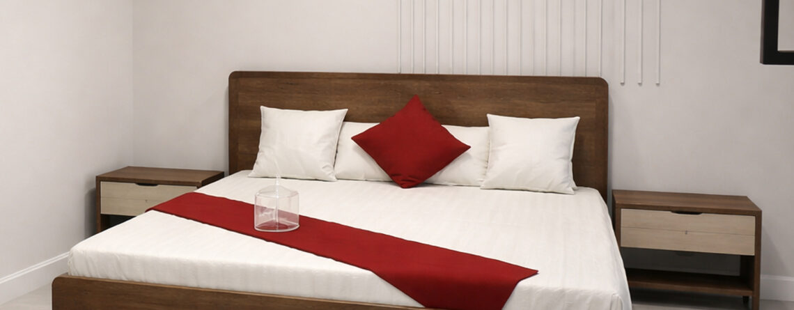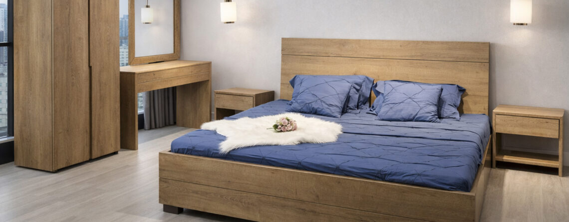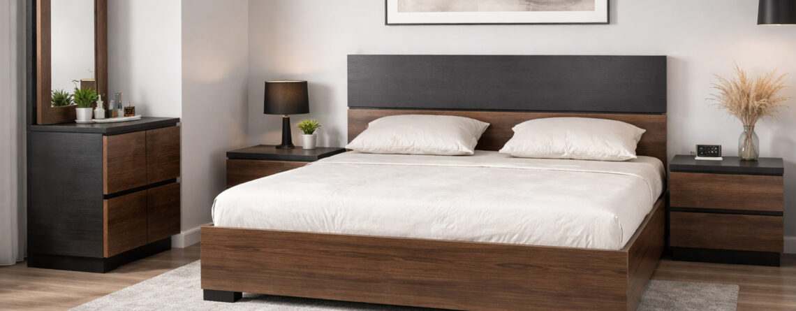 Material: Melamine Colors: Synchro Walnut Brown Melamine | Walnut Tex Melamine | Urban Oak Melamine | Pegodas Melamine Dimensions: King Size: 6 ft by 6.5 ft | Queen Size: 5 ft by 6.5 ft Back Board Height: 46" | Foot Board Height: 16" Side Table Height: 20" | Length: 22" | Depth: 16" Wardrobe: Height: 6.5 ft | Length: 40" | Depth: 22.5"
