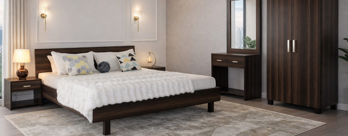 Bed Size: King Size: 6 ft by 6.5 ft | Queen Size: 5 ft by 6.5 ft Back board Height: 42″ | Footboard Height: 14″ Side Table: Height: 18″ Length: 18″ | Depth: 16″ Dresser Height: 32″ Length: 3.5″ | Depth: 18″ Mirror: Height: 42″ | Length: 30″