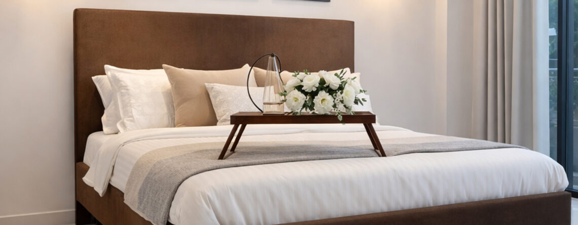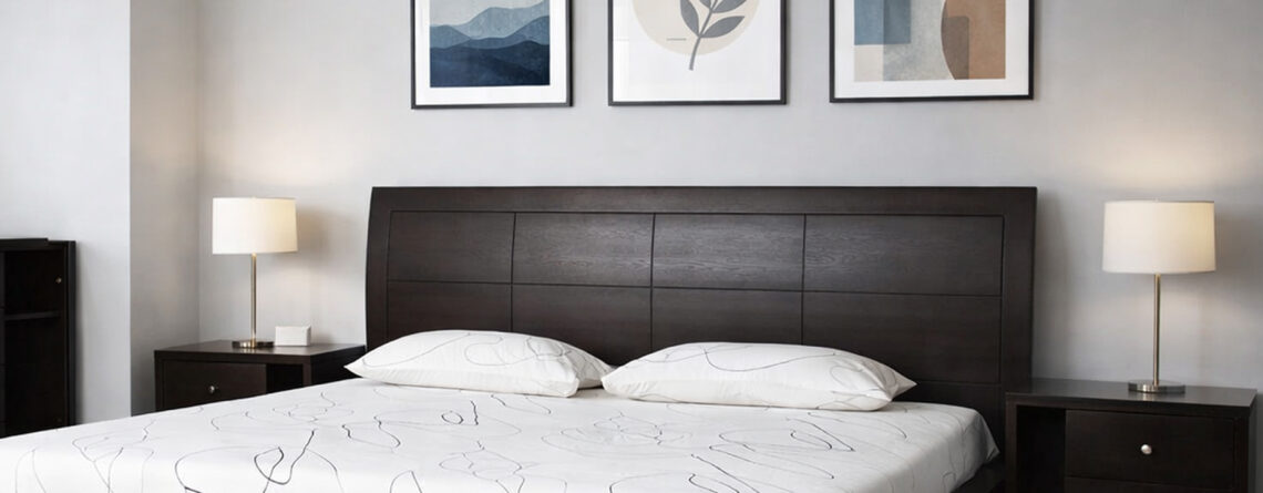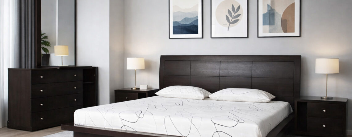 Material: Melamine MDF, Pure Oak Wood Legs Structure, Glass top Colors Available in Bed Back Cushioning: Black | Grey | Beige | Brown Colors Available: Dark Bronze Melamine with Black Combination | Wood Veneer Brown with Black | Pegodas Brown with Black | Synchro Walnut Brown with Black *Main image color is Wood Veneer Brown with Black Combination Dimensions: Bed: King Size: 6 ft by 6.5 ft | Queen Size: 5 ft by 6.5 ft Without Back Cushioning Bed Back Board Height: 42" | Foot...