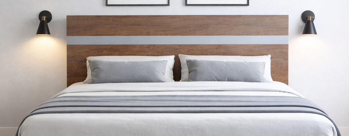 Material: Melamine, legs in pure wood and structure in pure wood Colors Available: Synchro Walnut Brown Melamine | Dark Bronze Melamine | Urban Oak Melamine | Pegados Melamine Dimensions: King Size: 6 ft by 6.5 ft | Queen Size: 5 ft by 6.5 ft Back Board Height: 46" | Foot Board Height: 16"
